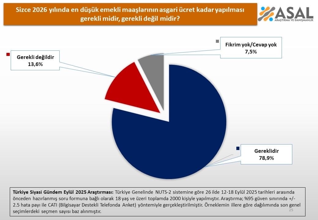 ASAL Araştırma’nın eylül ayında 2 bin kişiyle yaptığı emekli maaşı anketinde dikkat çeken sonuçlar ortaya çıktı. Türkiye Siyasi Gündem Eylül 2025 Araştırmasu NUTS-2 sistemine göre 26 ilde 12-18 Eylül tarihleri arasında gerçekleştirildi.
