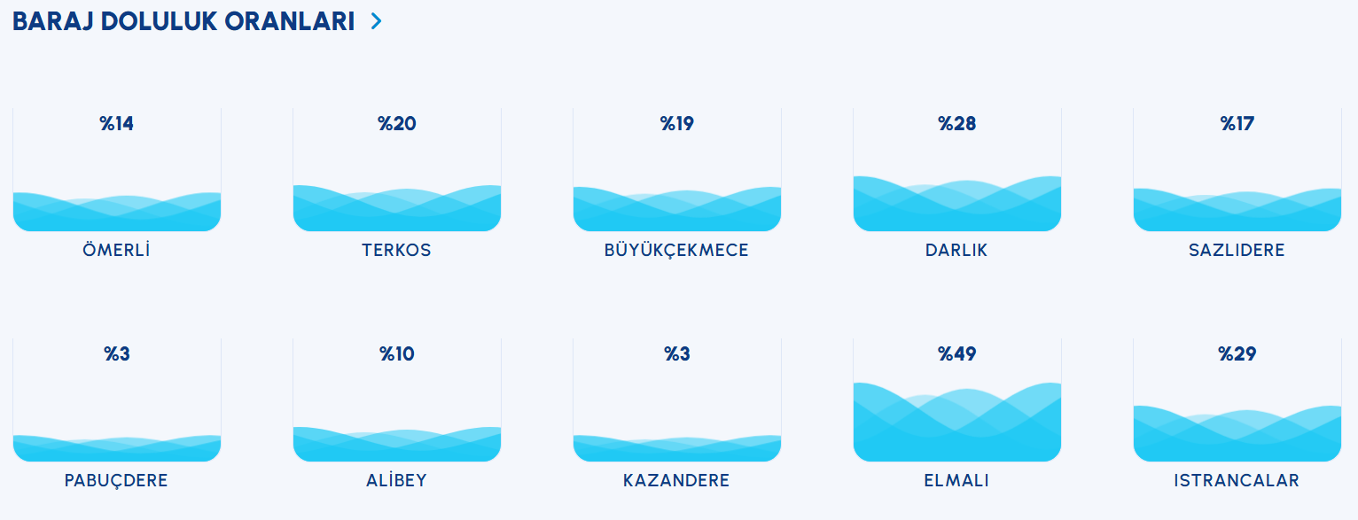 4 Aralık 2025 günü itibariyle Alibey, Büyükçekmece, Darlık, Elmalı, Kazandere, Pabuçdere, Sazlıdere, Terkos, Ömerli ve Istrancalar barajları için ortalama doluluk oranı yüzde 17.63 seviyesinde.